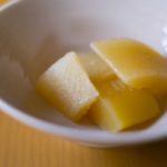 次に「叩き牛蒡」ですが、包丁の峰の部分で牛蒡を叩いたあとに、酢をまぜて茹でた料理です。